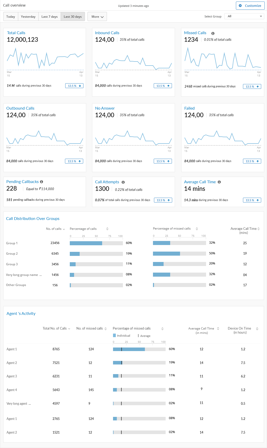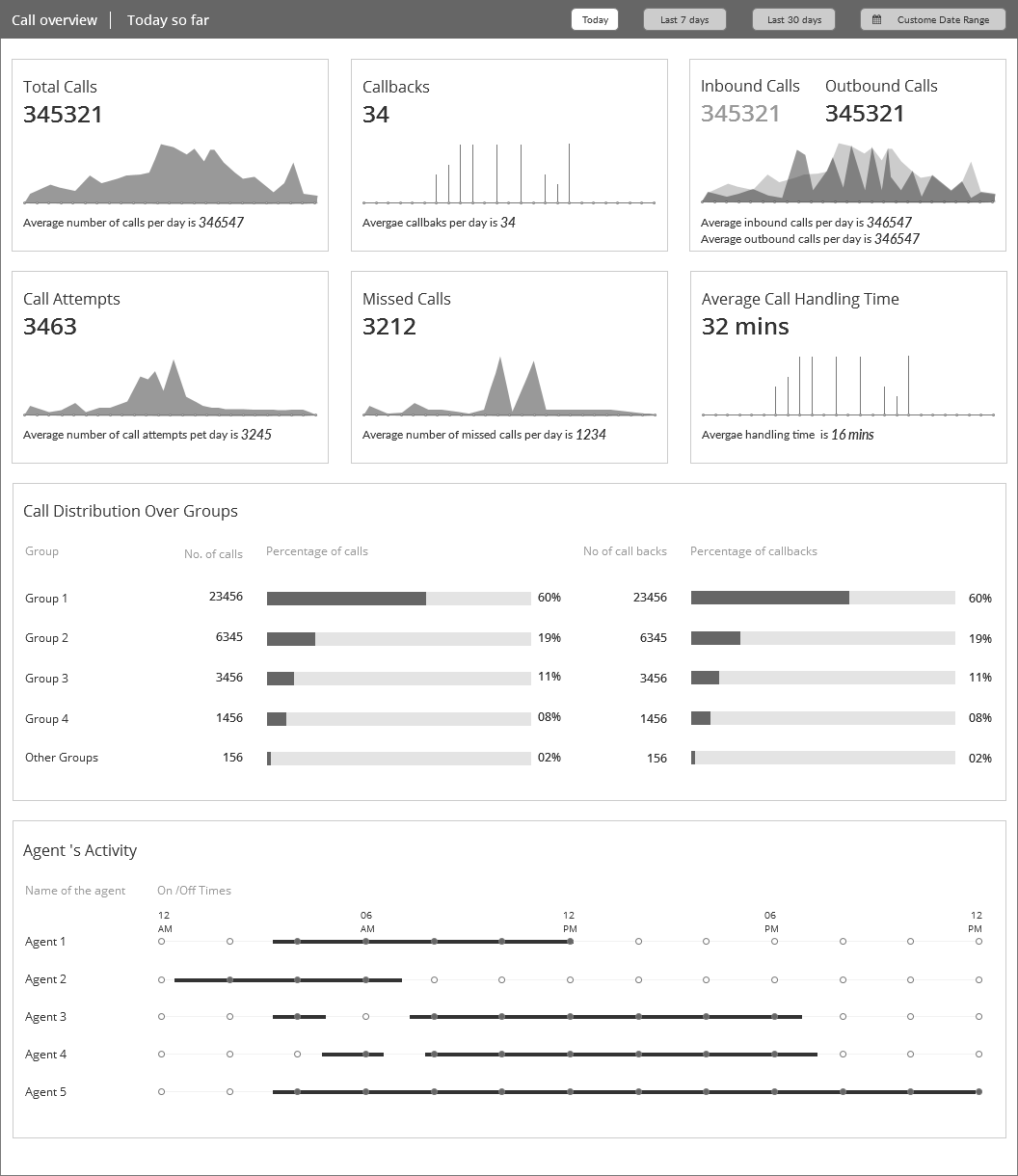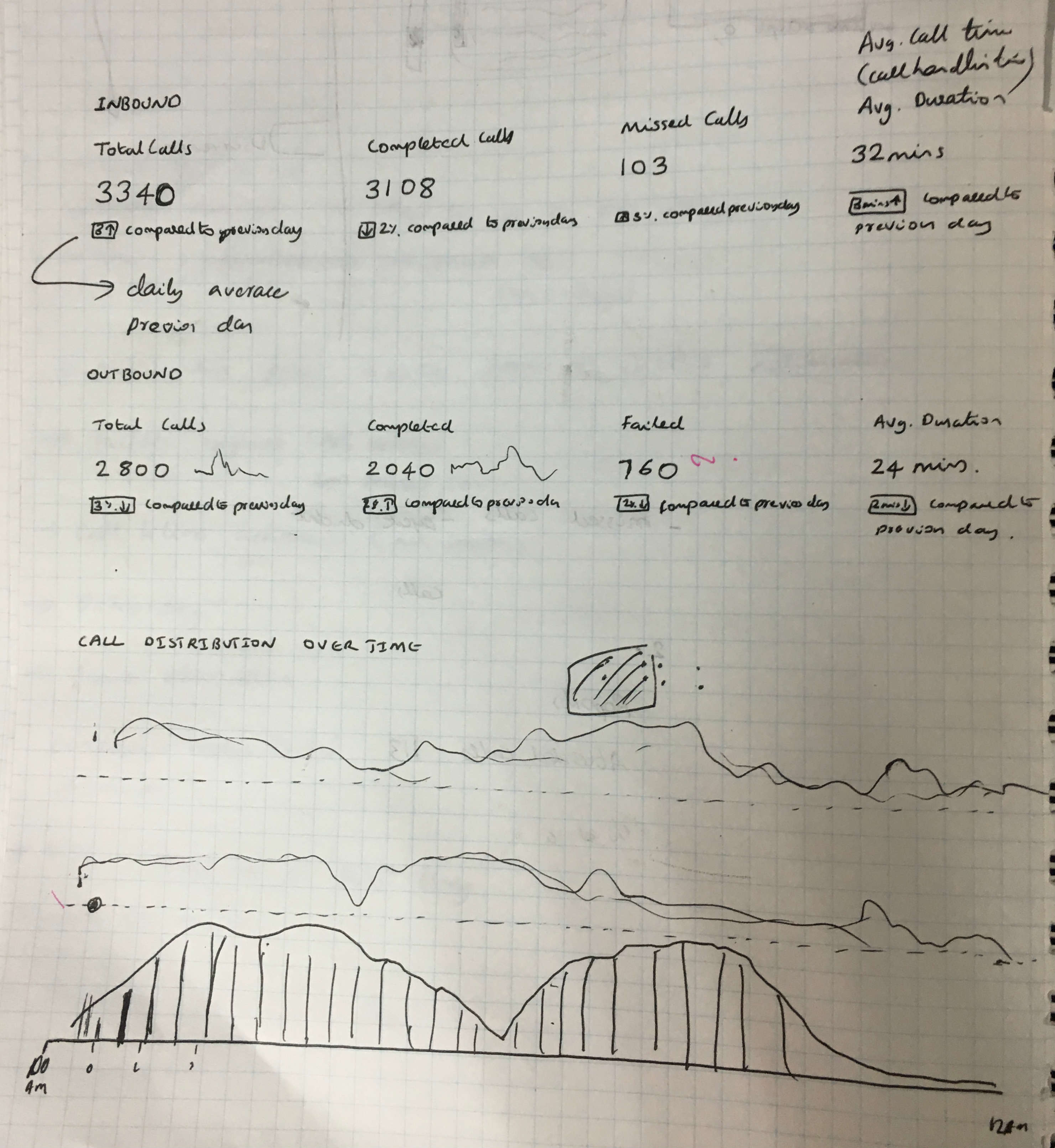 People cannot take the decision based on the data alone. To make meaningful comparisons and derive insights they need context. The decision to include the graph for the call distributions and the ticker which compares the data displayed with a previous time frame help users to answer the question "compared to what?".The decision to include the graph for the call distributions and the ticker which compares the data displayed with a previous time frame are intended to answer the question "compared to what?".